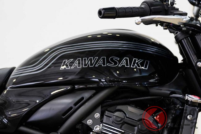 デザインの細部にわたるこだわりもこのモデルの魅力です。燃料タンクには、カワサキの伝説的モデル「マッハシリーズ」に敬意を表し、レインボーラインのグラフィックが施されました。タンクに配置されたKAWASAKIロゴは転写フィルムで表現されており、下地のボディカラーが透けることで独特の質感を演出します。