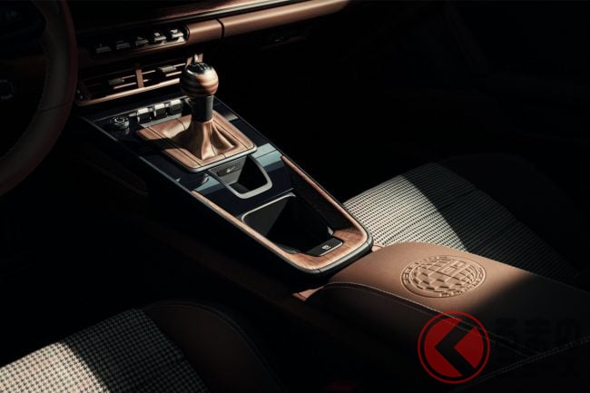 トリュフブラウンのクラブレザーやウォールナット材のシフトノブと相まって、温かみのある空間を演出しています。シフトノブにはF.A.ポルシェのサインが刻印されています。