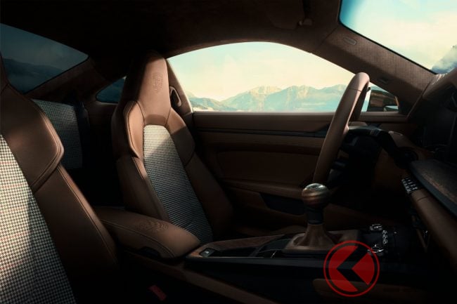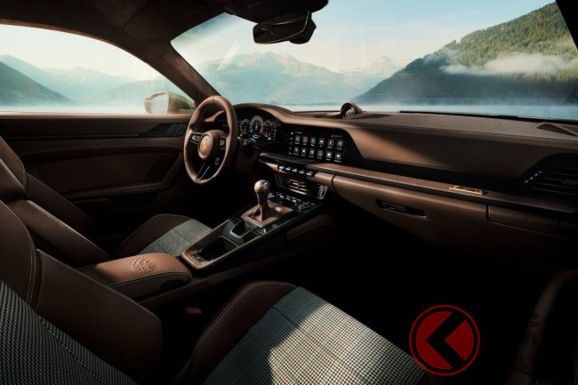 インテリアも特別な仕立てです。シート中央部には、F.A.ポルシェが愛用していたジャケットの柄を模したF.A.グリッドウィーブと呼ばれるチェック柄のファブリックを採用。