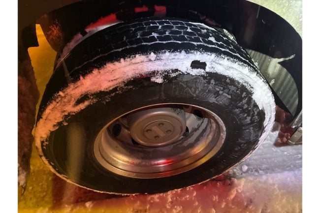 写真には大型除雪車にけん引されるトレーラーと、タイヤチェーンどころかスタッドレスタイヤすら履いていない状態のホイールが写っています。