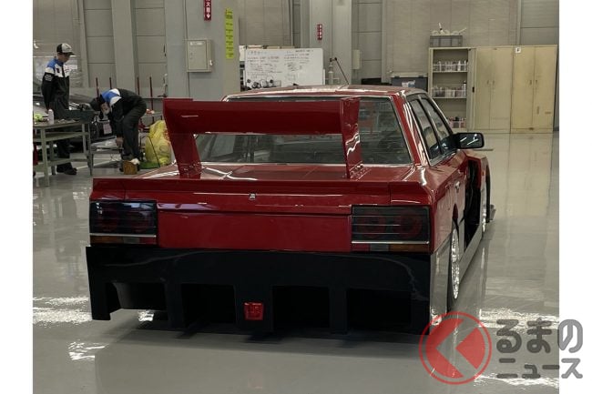 日産「斬新スカイライン」まもなく初公開! 旧車の「カクカクデザイン」に大型スポイラー装備! 鮮烈「赤×黒2トーン」の“学生製作マシン”「Re30 スカイラインシルエット」TAS披露への熱意が凄かった