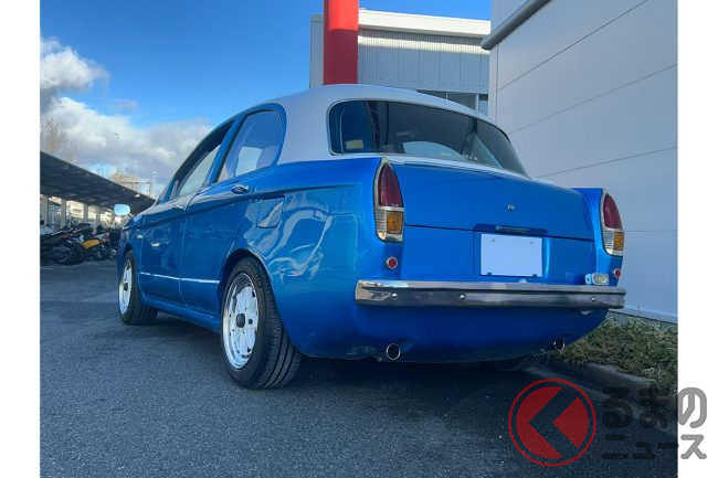 フロントは丸目2灯ライトや特徴的なグリルをはじめ、丸みのあるデザインをFRPで再現。リアはマーチがハッチバックであることからトランクがありませんが、フレームを延長してトランク形状とし、さらにブルーバードのトランクを加工して取り付けています。