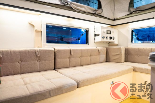 内装は白を基調とした上品なインテリアで、L字型ソファと分割クッションを組み合わせることで幅1200mm×奥行き2100mmのセミダブルサイズ相当のベッドに展開可能です。