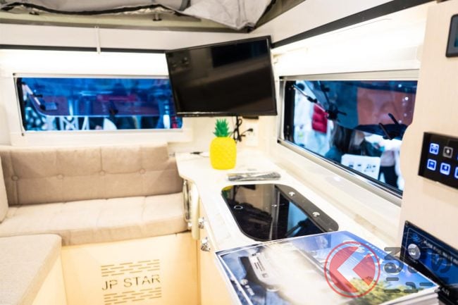 大型シンクや給排水タンクを標準装備し、バンクベッドとソファベッドを組み合わせれば最大4名が就寝できます。