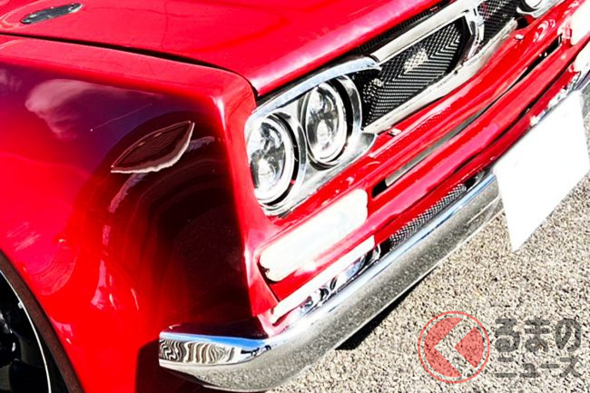 ハコスカの特徴でもある丸目4灯ヘッドライトのデザインはそのままに、LED化などで最新モデルのような雰囲気を演出。テールランプはボディの変更に伴い、横にずらして再設置と、大掛かりなカスタムになります。