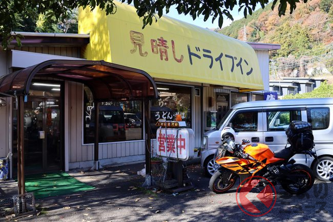 中央道「相模湖IC」から約5分の位置、国道20号線「甲州街道」沿いにある「見晴しドライブイン」は、黄色の屋根と味わい深いフォントが印象的な、これぞ“昭和のドライブイン”という風情。