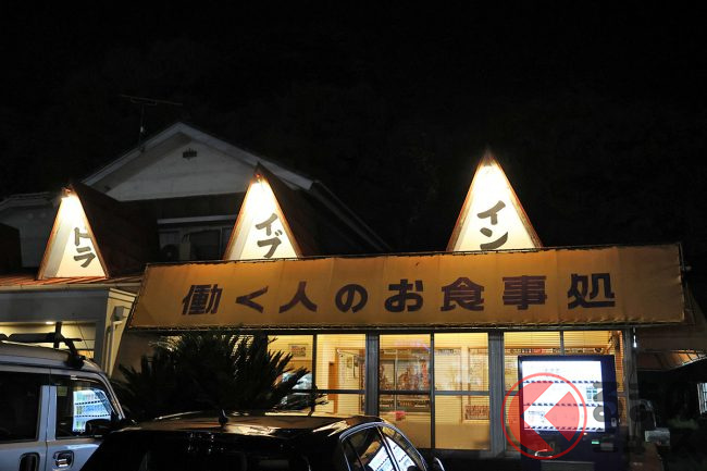 広大な駐車スペースは、大型トラックでも余裕しゃくしゃく。そして、「ドライバーのオアシス」&「働く人のお食事処」というキャッチコピーと、5つ並んだ小さな三角屋根が、ドライブイン好きのハートを鷲掴みします。