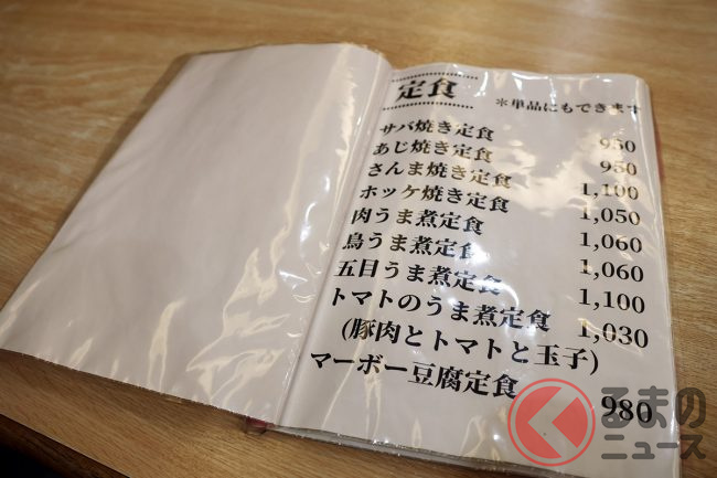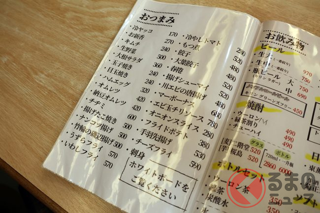 店内はテーブル席をメインに、長居したくなる小上がり席も用意されています。メニューは実に多彩で、定食系や麺類はもちろん、単品の「おつまみ」も魅力的。常連さん以外は即断即決するのは困難で、メニューとの“にらめっこ”がしばらく続くと思われます。