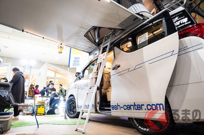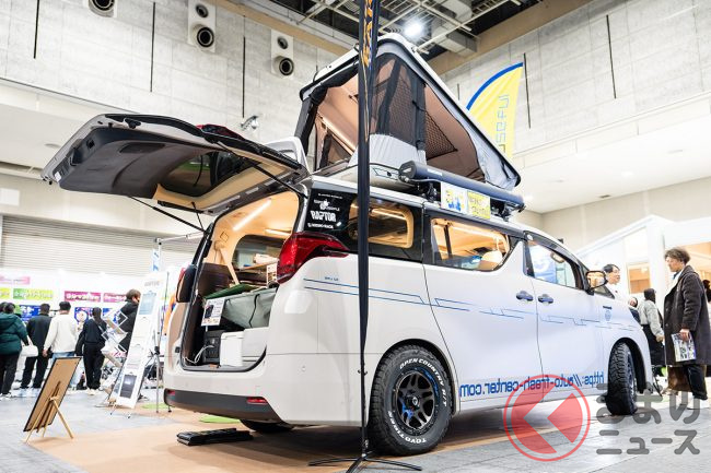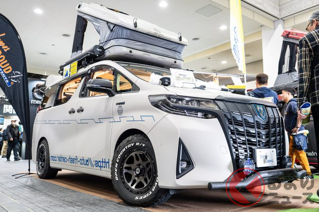 トヨタの高級車「アルファード」の“ゴツゴツ”キャンピングカーがスゴい! サンルーフから出入りできる斬新ルーフテント搭載! 車中泊も快適なビーユースフルの“カスタムミニバン”とは!