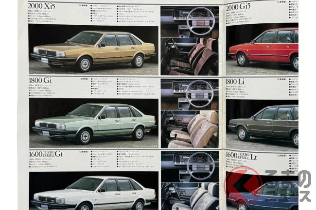 国内発売開始時の“日産”サンタナのバリエーションは、VW・アウディ製2リッター直列5気筒「J型」搭載の「2000 Xi5」「2000 Gi5」、VW製1.8リッター直列4気筒「JN型」を積む「1800 Gi」「1800 Li」、そしてVW製1.6リッターディーゼルターボ「CY型」が載る「1600 ターボディーゼルGt」「1600 ターボディーゼルLt」を設定しています。