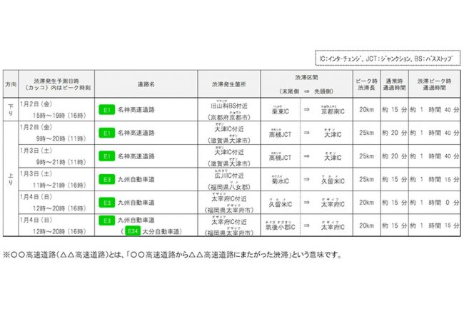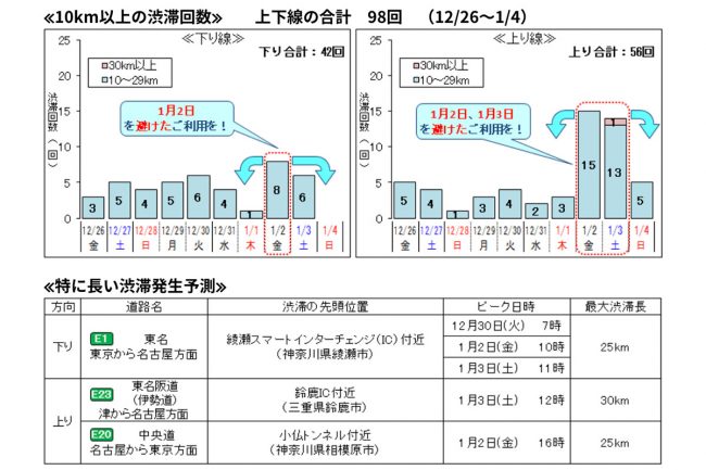 下り線では1月2日に21回、1月3日に15回の「10km以上の渋滞発生」が予想されています。