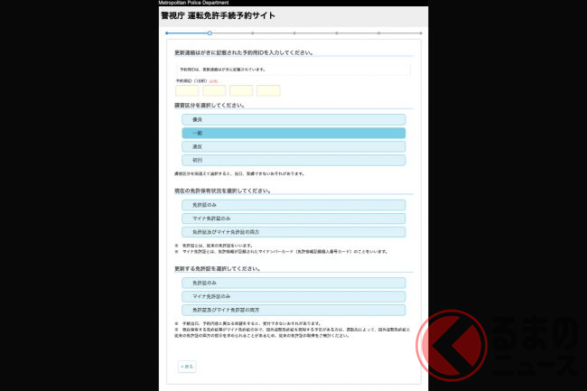 警視庁の運転免許手続予約サイトでは、免許更新ハガキに記載された予約用IDや講習区分、更新する免許証などを選択する画面があります(画像参照)。