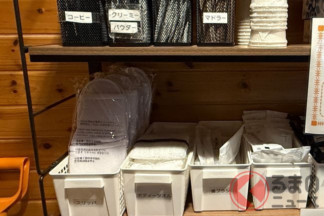 また、受付棟にはタオル類や歯ブラシなどのアメニティが常備されており、必要な分をセルフサービスで持っていくスタイル。