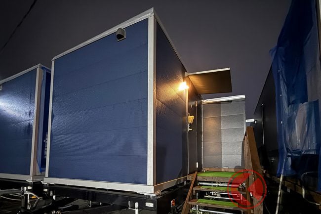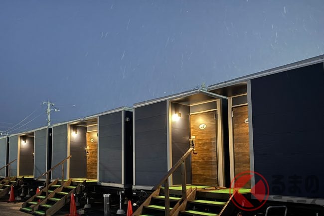 今回宿泊したのは、コンテナのような四角いボディが整然と並ぶ、トレーラー型の簡易宿泊施設です。