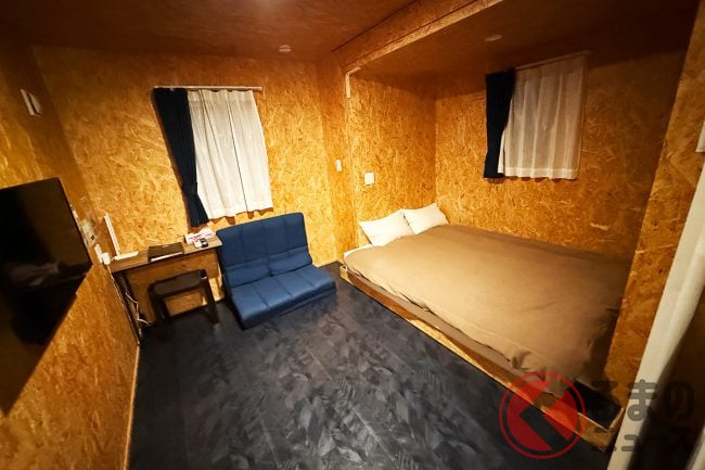 限られたスペースながらレイアウトは巧みで、大きめなサイズのベッドに加え、ベッドにもなるソファ、そしてPC作業も可能なデスクとチェアまで完備。1人で過ごすには十分すぎるほどの広さが確保されています。