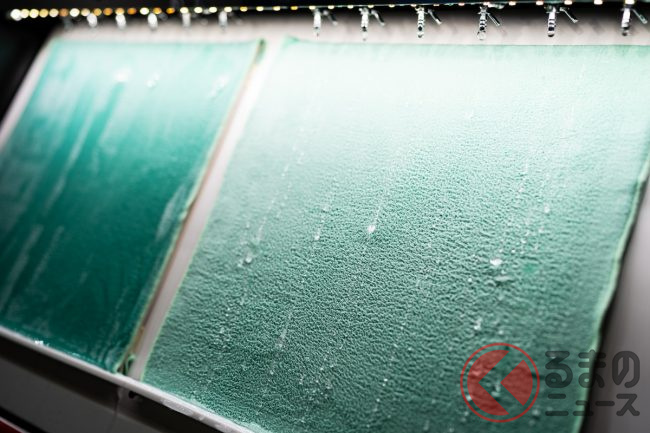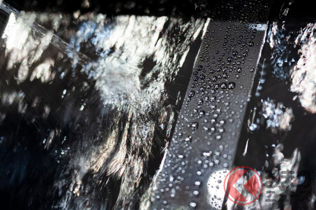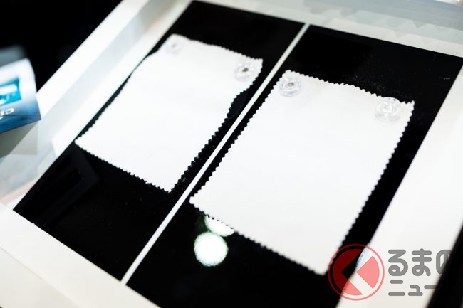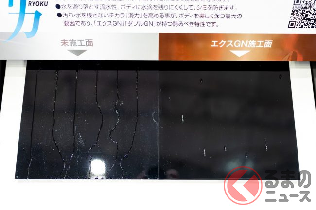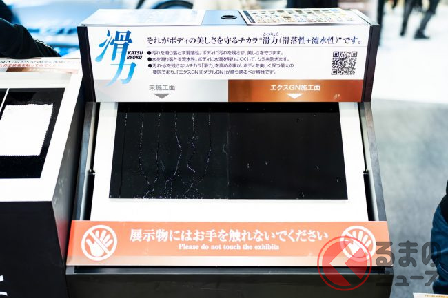 また、滑力タイプだけではなく、水膜を維持しながら乾いていく「親水」タイプも参考出品として展示されていました。ルーフなど平面な部分に水滴が残ることによって発生するウオータースポットを気にするユーザーから、親水タイプへの支持があるとのことです。