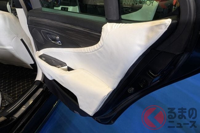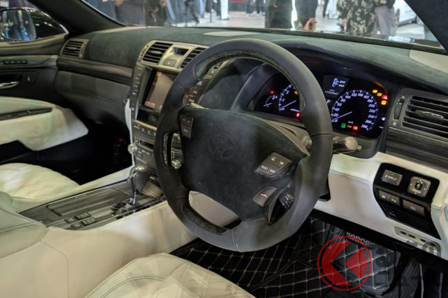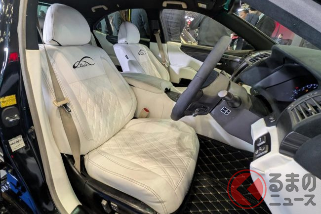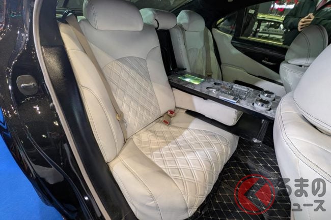 斬新「ヴェルファイア セダン」初公開! “全長5m超え”ボディ&「ド迫力顔」採用! 「豪華な白内装」に“光るVIPな仕掛け”も! 「V8エンジン×FR」で高級感漂うレクサスLSベースのNATS「大型セダン」登場!