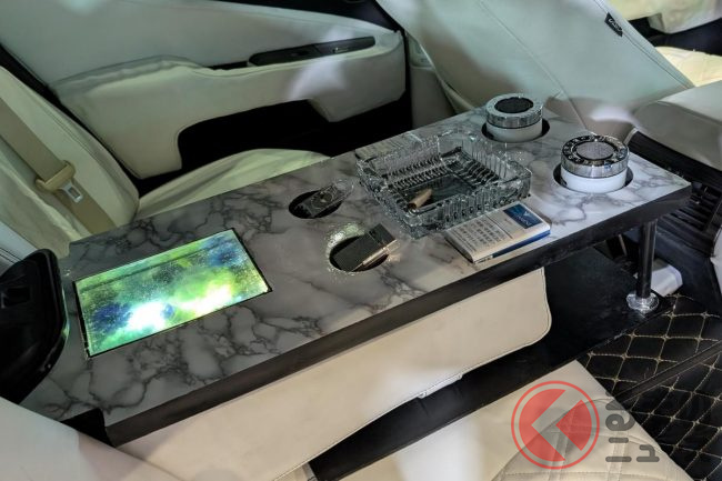 リアコンソールは特に力を入れた部分で、「昔の高級車みたいなVIP感を意識して作りました。イグニッションをオンにすると光るようになっています」と、来場者の目を引く仕掛けも施されています。