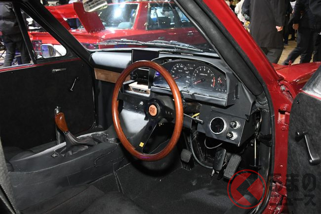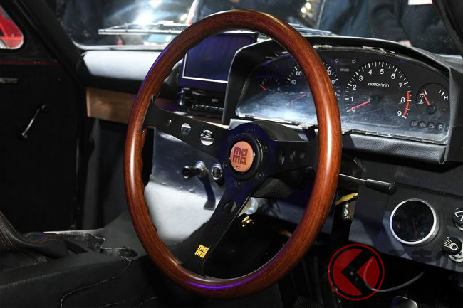 ボディを彩る鮮烈な赤は、学生が考案した「トーマレッド」と呼ばれる特別色です。カラーリングを検討する際、当時の資料からサニークーペやハコスカにおいて赤が非常に貴重な色であったことを知り、「昔の貴重と今の貴重を掛け合わせる」というコンセプトのもと、あえてこの色を選択。重厚感ときらびやかさが共存する、唯一無二の存在感を放っています。