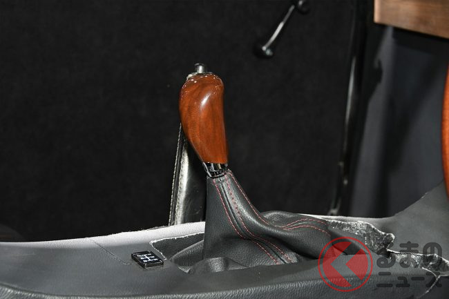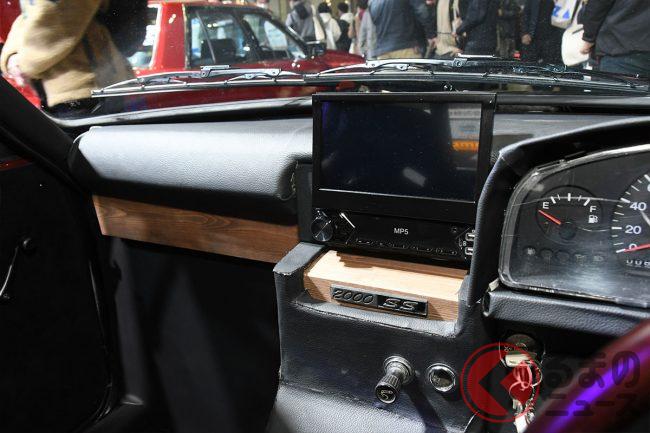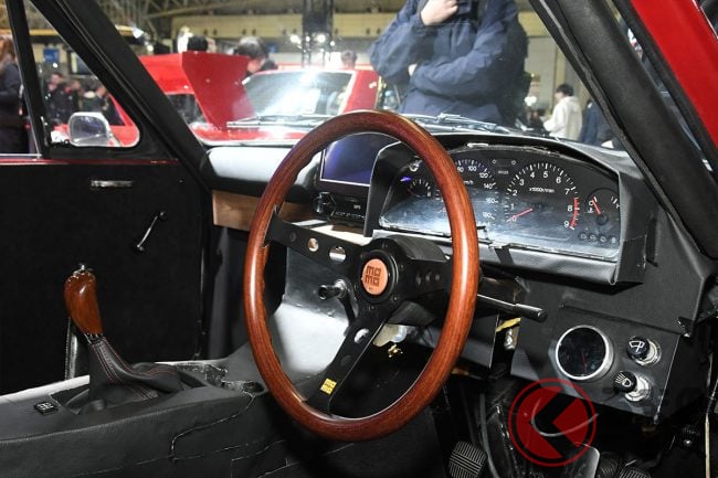 内装は、木目調のレトロな質感とタッチパネルオーディオによる利便性を両立。部品が皆無の状態からコンソールなどを自作し、本物の木を採用してレトロ感を演出しています。ステアリングに合わせてシフトノブを塗装するなど細部まで色彩を統一し、旧車の面影を現代風に体現しました。