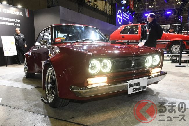スゴい「日産サニー」初公開! 丸目4灯“ハコスカ顔”&「S15シルビア」の2リッターエンジン搭載! おじさん世代が歓喜する!? 日産京都自動車大学校の斬新「サニースカイライン」とは!