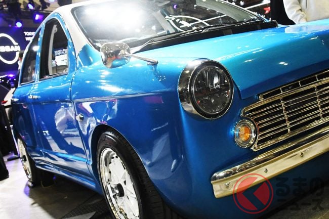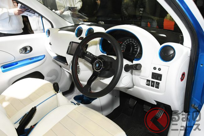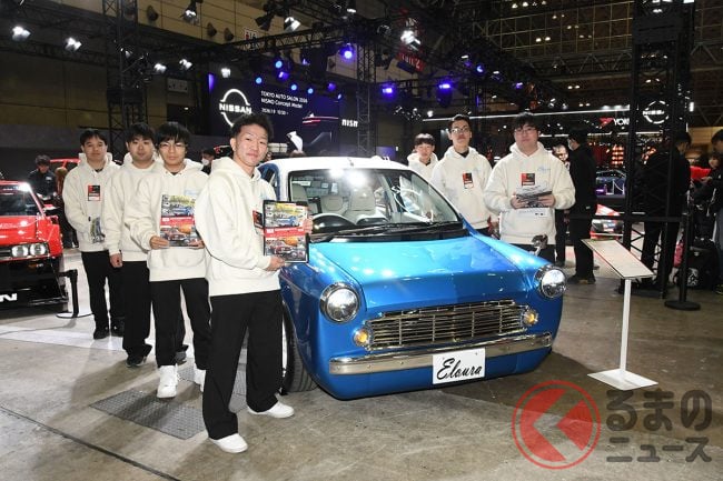 日産「斬新ブルーバード顔マーチ」初公開! 5速MT搭載&「丸目の旧車デザイン」採用! 会場で大注目の学生製作“苦労の手作りマシン”「MARCH Eloura」TAS26で披露