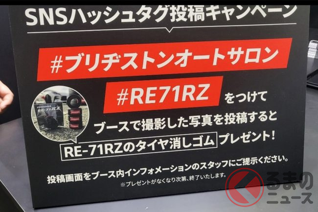 ブリヂストンが、2026年1月9日〜11日に幕張メッセ(千葉市)で開催中の世界最大級のカスタムカーイベント「東京オートサロン2026」に出展しています。「10年後、20年後にも『走るわくわく』を提供し続ける」をコンセプトに、新商品「POTENZA RE-71RZ」などを展示しています。