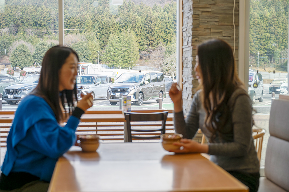そろそろお昼どきになり、おなかが減ってきた私たちは「峠の釜めし」を目当てにサービスエリアへピットイン。黒木さんは初「おぎのや」ということで、焼き物の器にまず「かわいい」と大喜び。私も幼い頃から慣れ親しんだ味に、ホッと気持ちが和みます。