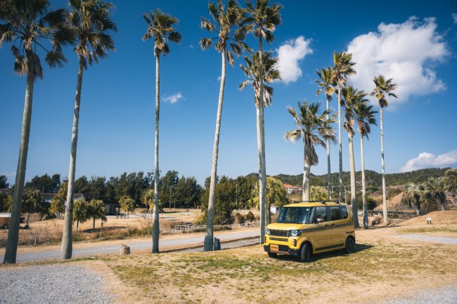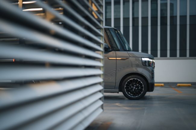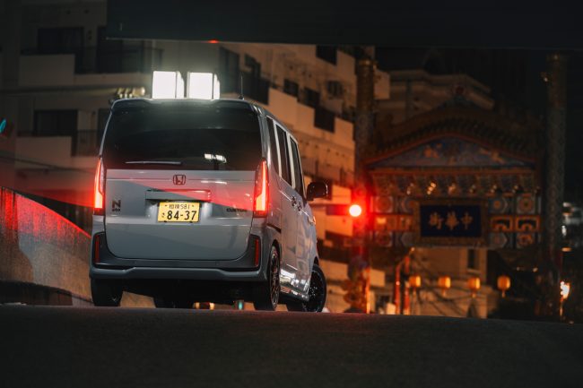 東京オートサロン2025に出展された、N-BOX CUSTOM(カスタム)をベースにした「ロドニー」のデモカーでやってきたのはベイエリア。近代的なオフィスビルが立ち並ぶシャープな都市の風景に、グレーカラーのボディを持つスタイリッシュな顔に生まれ変わったフェイスラインがよく似合います。
