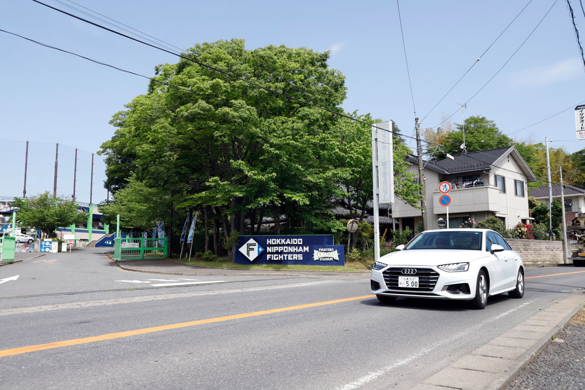 この寮は北海道日本ハムファイターズ2軍の専用球場であるファイターズ鎌ケ谷スタジアム内にあるそうですが、行ってきましたよ、オータニKC1000を履いたアウディA4でファイターズ鎌ケ谷スタジアムまで!(笑)