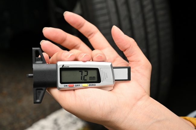 タイヤの溝を専用のゲージで測ってみると、新品のタイヤは8.1mmだったのが、7.2mmまで減っていました。重量級のクルマかつ、約2万キロを走ったことを考えると、0.9mmしか減ってないというのは、耐摩耗性はかなり高いと言えるのではないでしょうか!?