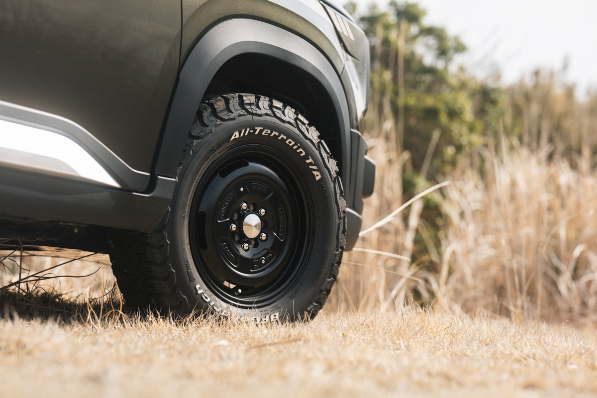 「リバーブ」のデモカーに採用される足周りは、クリムソン社製 DEANクロスカントリーのホイール(16inch 6.5J+43)に、タイヤはBFグッドリッチのオールテレーンT/Aのコンビ。