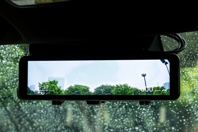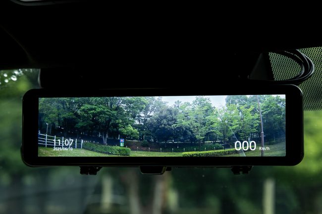 また、デジタルミラーということで、ディスプレイ部には後部の映像のほか、時刻や日付、GPSが取得した速度などの情報も表示されます。大きく視線を動かすことなくおおよその情報を見ることができるのも、デジタルミラーならではの機能となっています。