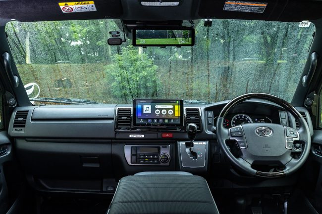 今回デジタルミラー型ドライブレコーダーを装着したのは、仕事にレジャーに高い人気を誇る200系ハイエース。ボンネットがない分、外からルームミラーの存在感が目立つ車種ですが、黒基調の「VREC-MS700D」は後付け感のないスマートな装いです。