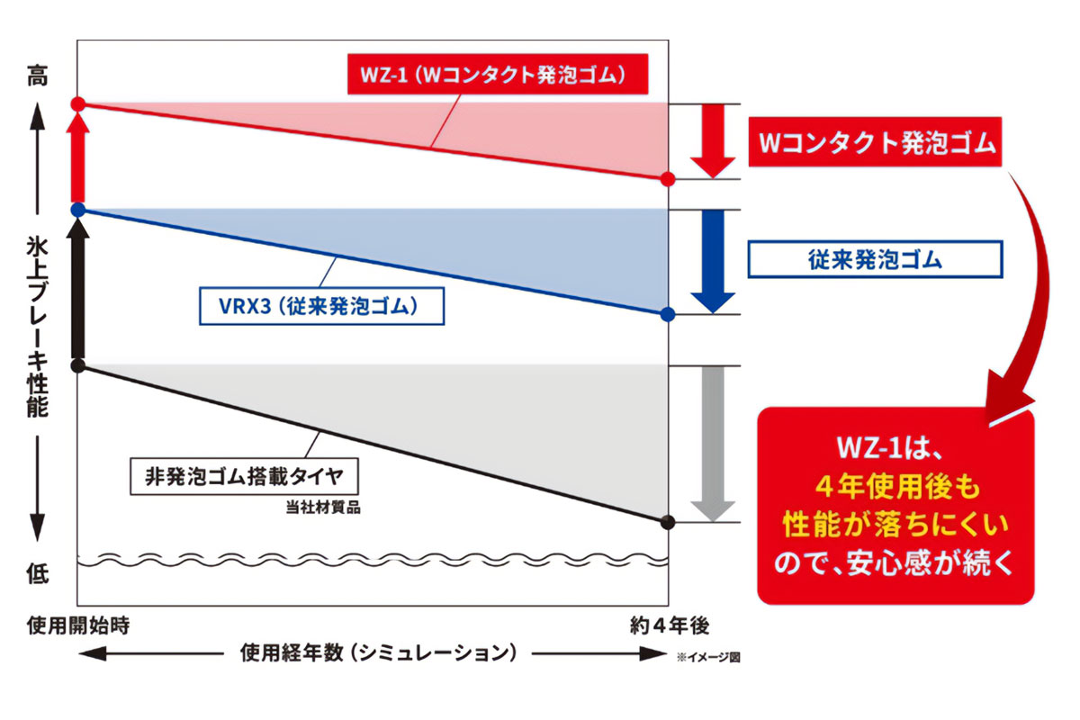 しかし、WZ-1は驚くべきことに、4年経過したものでも氷上ブレーキ性能において、新品の現行モデルであるVRX3をも上回るという結果が公開されています。これは、タイヤの基本性能を徹底的に鍛え上げるENLITEN技術と、新開発のWコンタクト発泡ゴムが、時間の経過による性能低下を極限まで抑えていることを示しています。