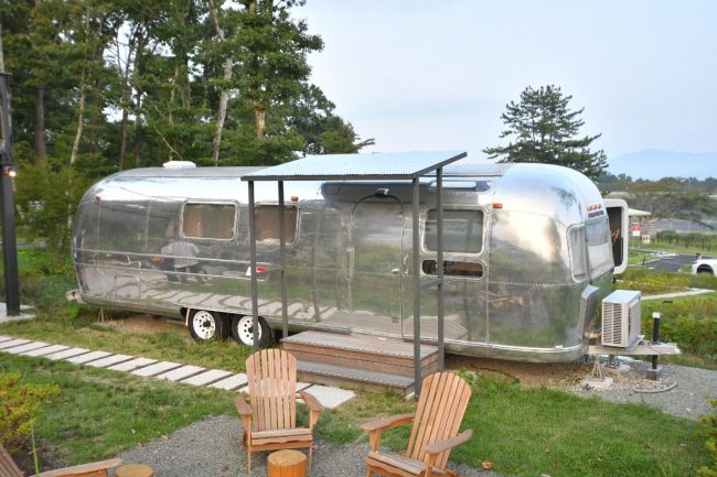 今回は、「ビンテージトレーラーコテージ」と「トレーラーヴィラ」に宿泊。ビンテージトレーラーではアメリカから輸入したエアストリーム「sovereign(1970年製)」に展望テラス付きのサイトがついた場所で、快適な寝心地を実現するダブルベッド、オーバーヘッドシャワー、トイレ、エアコン、キッチンなど最新設備を完備した古き良き面影を随所に残したトレーラーです。