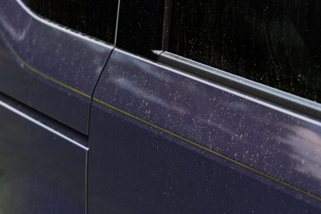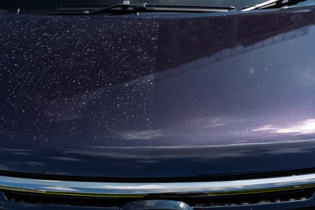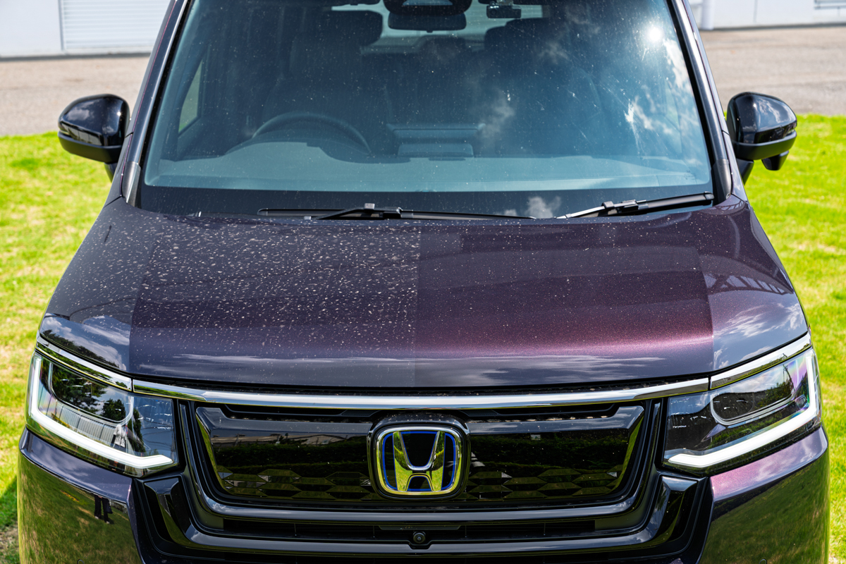 今回はその「防汚性」を確認するために、ボンネットの向かって右半分(助手席側)だけHonda純正ボディーコーティングを施工したクルマを用意しました。このステップワゴンは施工後、高速道路走行を含む日常使いに加えて、約1カ月間洗車しない状態で屋外駐車していたクルマです。