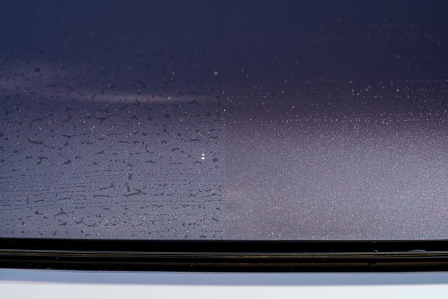 またコーティングの中には、あえて低撥水性のもの(プレミアムグラスコーティング ウォーターランニング)も用意されています。これは、レンズ効果による焼き付きと、空気中の汚れ成分や水道水のカルキ成分によるイオンデポジットの2種類からなる水シミや水アカを、低撥水であることにより、軽減できるもので、水シミができやすい濃色車におすすめとのことです(撥水が好きな人は強撥水タイプでもOK)。