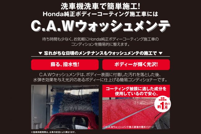 また「ボディーコーティングは新車時に行うもの」というイメージが強いかもしれませんが、Honda純正ボディーコーティングには中古車や、すでにお乗りの経年車向けのコーティングも用意されているので、新車でなくとも愛車を美しい状態で維持したいと考えている人にもオススメできます。