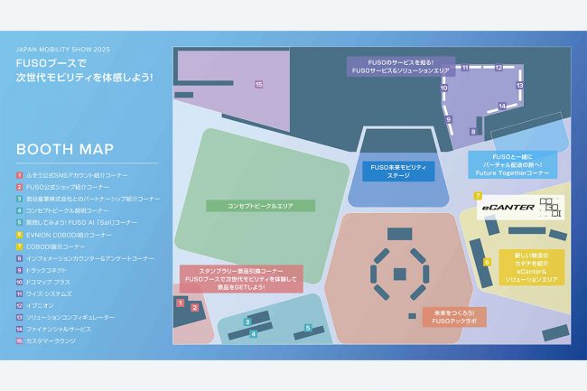 JMS2025の三菱ふそうブースでは、ここまでに紹介した「H2IC」や「H2FC」、「COBODI」に加え、さまざまな展示が行われます。ブースマップとともに各エリアを見ていきましょう。