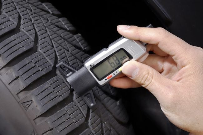 新品時のシンクロウェザーは、サイズによって差があるものの、乗用車サイズでは8.0mm〜8.5mmの溝深さがあるようです。そこでLBXで1万2000キロを走ったシンクロウェザーの溝深さを計測してみると、深い場所で6.8mmの溝深さになっていました。