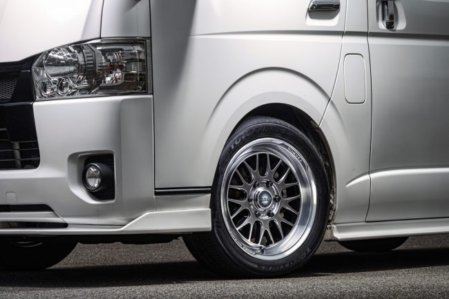その特徴は、HOMURAブランドのホイールが備えるプレミアムかつ普遍的なクロススポークデザインを軸に、センターパートのボリューム感を意識させない造形美と、他社製では成しえないリムのアドバンテージ。圧倒的な存在感を演出するホイールとして、ハイエースユーザーからはすでに高い支持を集めていました。