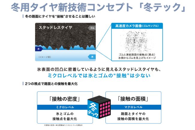 これを改善するのがアイスガードエイトに採用された「冬テック」で、まずはミクロレベルの氷とゴムの接触点を最大化することで「接触の密度」を高めるとともに、路面とタイヤの接触面積を最大化することで「接触の面積」を増やすことに成功したそうです。