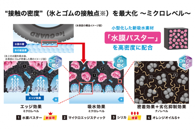 それぞれ詳しく説明すると、まずは「水膜バスター」を新開発。これは従来品よりも小型化した新吸水素材で、これを高密度に配合することで氷とゴムの接触を妨げる水分を吸収する力を強化しました。従来品に比べて吸水量を8%向上させたと横浜ゴムは主張しています。