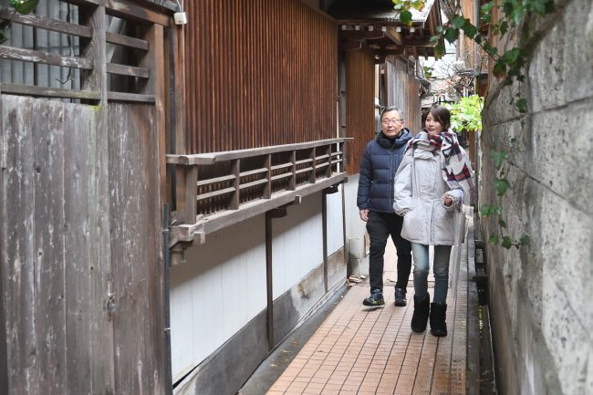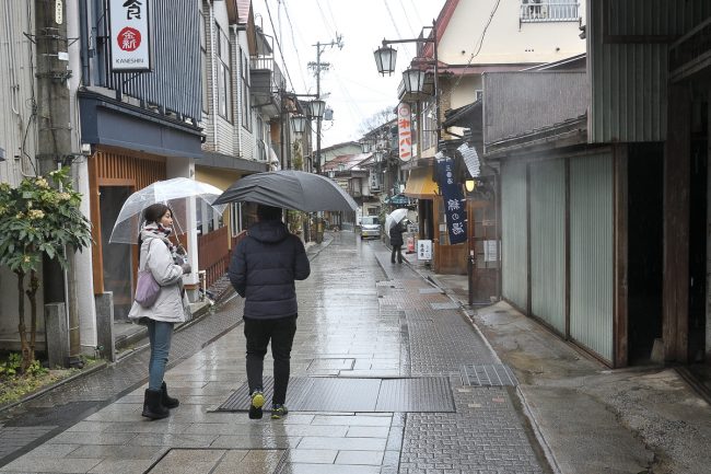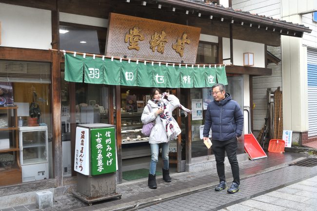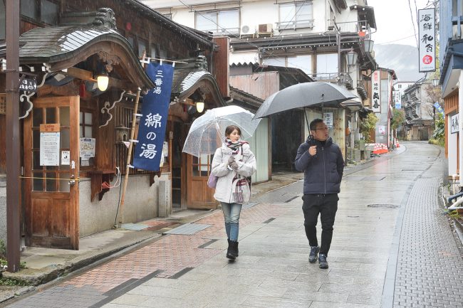 細い路地におよそ30軒の旅館が並ぶ渋温泉は、よくテレビなどで使われる「ひなびた温泉街」という表現を地で行くようなところです。しかも、お約束の温泉まんじゅうや温泉たまご、そして足湯など、温泉街に欠かせないアイテムもすべてそろっています。その街並みを見た瞬間に沢さんもぱっと目覚めたようで、目をキラキラさせながら通りを眺めています。
