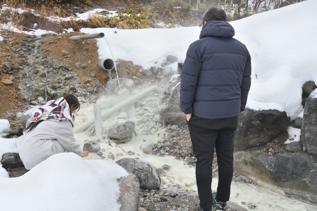 「あったかーい。もう出たくない!」と沢さん。その気持ちは私も同じでしたが、ここはまだ旅の終着点ではありません。後ろ髪を引かれる思いで(でも、名店“玉川”さんで温かいおそばをいただきました!)で渋温泉を出発すると、横手山を上っていきました。