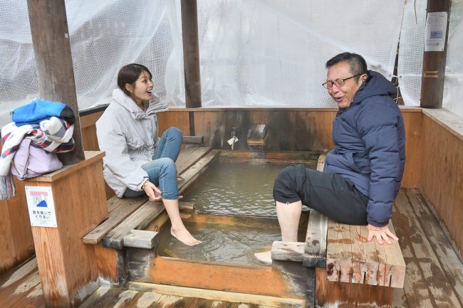 渋温泉には観光客も使える外湯が9カ所もあるのですが、今回は時間の都合で断念。かわりに、通り沿いにあった足湯に挑戦しました。ちなみに、私は足湯、初体験。靴下を脱いで足を湯につけると、ちょっと熱めのお湯がじんわりと全身を温めてくれます。