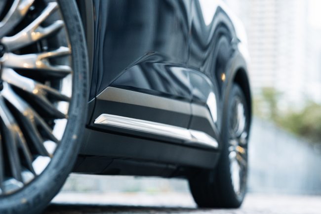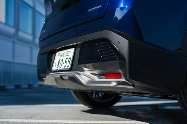 エクステリアでは、メタル調フィニッシュのプロテクターが車体のボトム部の前後左右にぐるりと装着されていて、低重心とワイドスタンスのイメージを高めています。また、ドアミラーも同じくメタル調フィニッシュとされています。