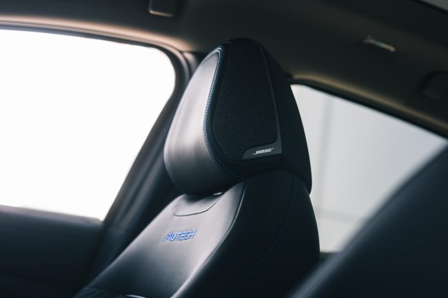しっとりとした触感が心地よいテーラーフィットのシートやステアリングとともに、最も目に入るインストパッドなどには、ブラックを積極的に用いるとともにAUTECHブランドを象徴するブルーのステッチやパイピングが配されています。さらに、基準車では選択する内装色によっては明るい色調となるシートベルトやドアトリム、アームレストも、ブラックとされています。