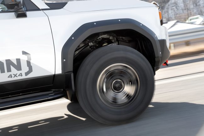 走り出して感じたのは、見かけから想像していたより快適で、「あれ、フツウに走れるな」という感想でした。外径35インチというサイズ、M/Tというカテゴリーからもっと荒々しいフィーリングをイメージしていましたが、低速域でのパターンノイズはあるものの、不快というほどではありません。